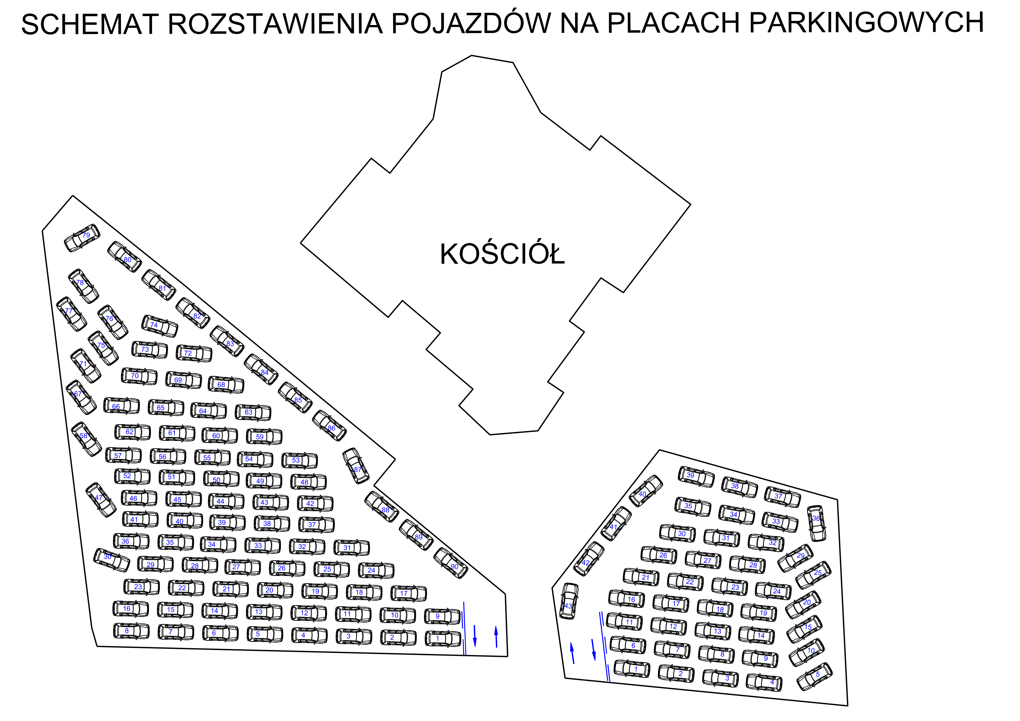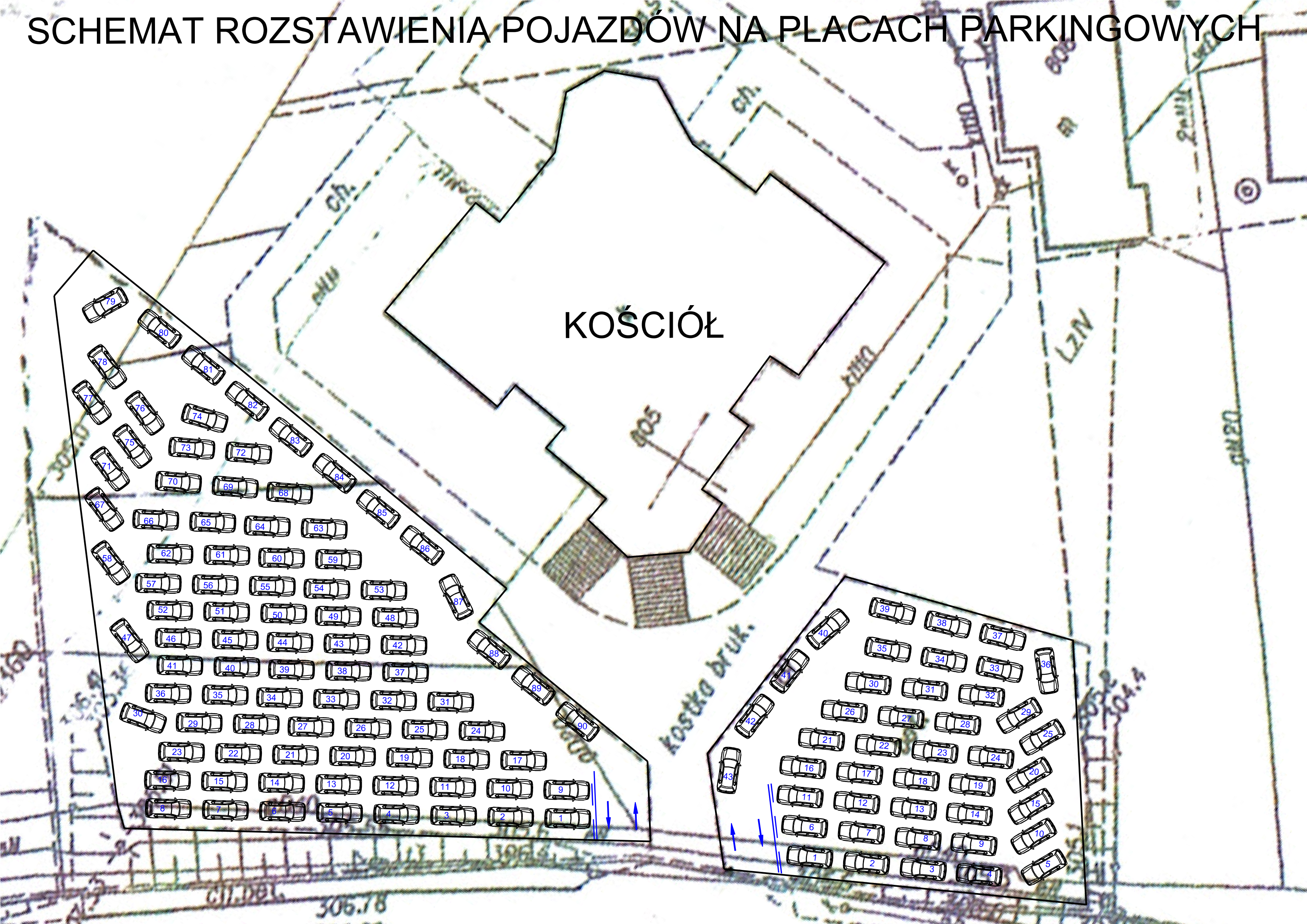 4. Na plac utwardzony kratą betonową wjeżdżamy od strony chodnika stanowiącego dojście dla wiernych do kościoła i ustawiamy samochody równolegle do ulicy Gorlickiej od strony skarp, jeden samochód za drugim w kolejności przyjazdu skierowane w kierunku wyjazdu, zachowując odległość bezpieczną między nimi dla przemieszczania się pasażerów tj. około 1m. Odległość  między kolumnami zostawiamy wielkości bezpiecznego otwierania drzwi samochodu.
